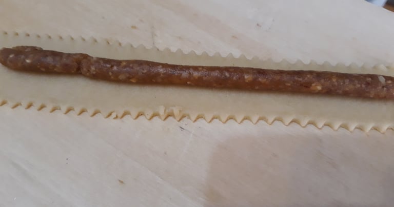 Si fa bollire il miele per 3 minuti, si aggiungono il pane grattugiato, le scorze di arancia, le noci e le mandorle tritate, la cannella, il caffè e il cacao. Si mescola continuamente finché non si ottiene un impasto morbido che una volta raffreddato, verrà utilizzato per riempire la pasta.