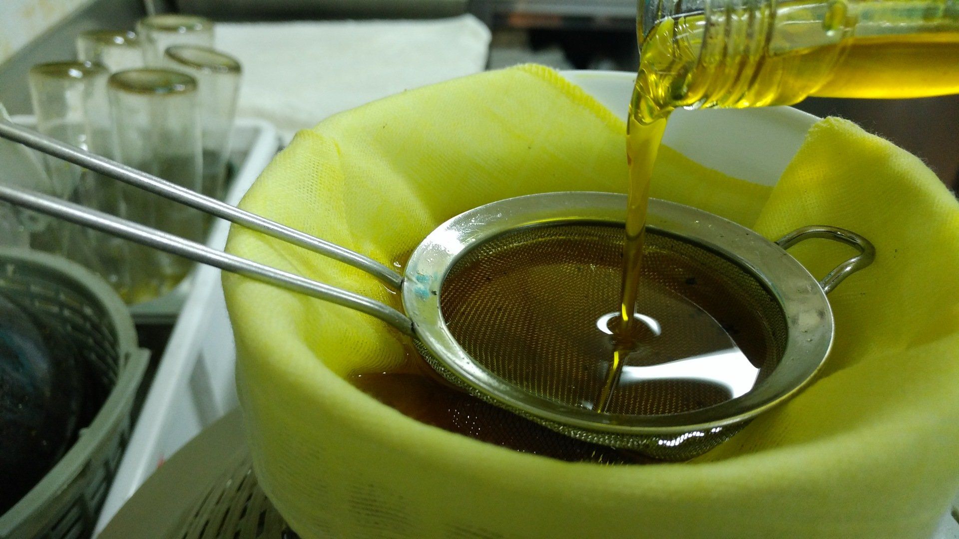 La cosecha de Lentisk (Pistacia Lentiscus) tiene lugar a fines del otoño, cuando las bayas están muy maduras. Para la recolección, tome una rama de lentisco en sus manos y frótela, teniendo cuidado de no arruinar el arbusto y asegurándose de que las bayas caigan en la canasta. La siguiente operación consiste en limpiar el Lentisk, eliminando los residuos de hojas y ramitas; después de lo cual las bayas se dejan reposar durante unos días en bolsas grandes. De esta manera se calientan y esto contribuye a mejorar la calidad del producto final. EXTRACCIÓN DE ACEITE CALIENTE Después de este período, el lentisco se coloca en una olla llena de agua y se hierve durante unos 60 minutos. Luego se recoge con el skimmer y se presiona con la prensa (en la antigüedad, una vez escurrido, se colocaba en bolsas de lino, las bolsas se cerraban girando la bolsa dos o tres veces alrededor de sí misma y luego se apretaba). apretando, las bolsas llenas se colocaron en un recipiente cóncavo y se aplastaron con los pies). El extracto obtenido del prensado se vierte en una olla y se devuelve a fuego lento; La olla debe colocarse ligeramente inclinada para facilitar la recogida de aceite. En esta etapa del procesamiento, se debe tener cuidado para evitar un vuelco peligroso del líquido en ebullición. Luego, el extracto se hace espuma para eliminar las impurezas que salen a la superficie. A medida que las superficies de aceite en la superficie se recogen suavemente con cucharas y cucharones. Luego, el producto se vierte, se embotella y se almacena en un lugar fresco y oscuro. En la antigüedad, como no era fácil abastecerse de aceite de oliva, el aceite de lentisco se usaba como aceite alimenticio. Con "l'ociu listincu" se frieron las frituras y se sazonó el minestrone de pasta y verduras. EXTRACCIÓN DE ACEITE EN FRÍO Después de la cosecha, el Lentisco se limpia de residuos de hojas y ramitas y se deja reposar durante unos días dentro de las bolsas. Posteriormente se muele con una máquina que hemos modificado; La pulpa obtenida se presiona y el aceite obtenido pasa a través de varios pasajes de filtrado. Se obtiene un aceite puro de alta calidad que se deja decantar por un tiempo en garrafas especiales, antes de ser almacenado en los recipientes de aceite apropiados. Como se especificó anteriormente, parte del aceite está destinado para uso en nuestras cocinas, parte se vende como aceite comestible y parte se entrega a un laboratorio especializado para la producción de cosméticos naturales a nombre y en nuestro nombre.