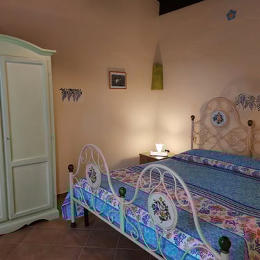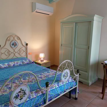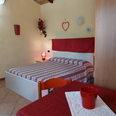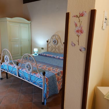 La camera n. 1 (Giallo) fa parte del primo gruppo di cinque camere matrimoniali. Tutte le camere hanno ingresso indipendente e si trovano al piano terra. La camera 1 è un po' più piccola della altre. È vicina al parcheggio, quindi molto comoda per lo scarico e il carico dei bagagli.