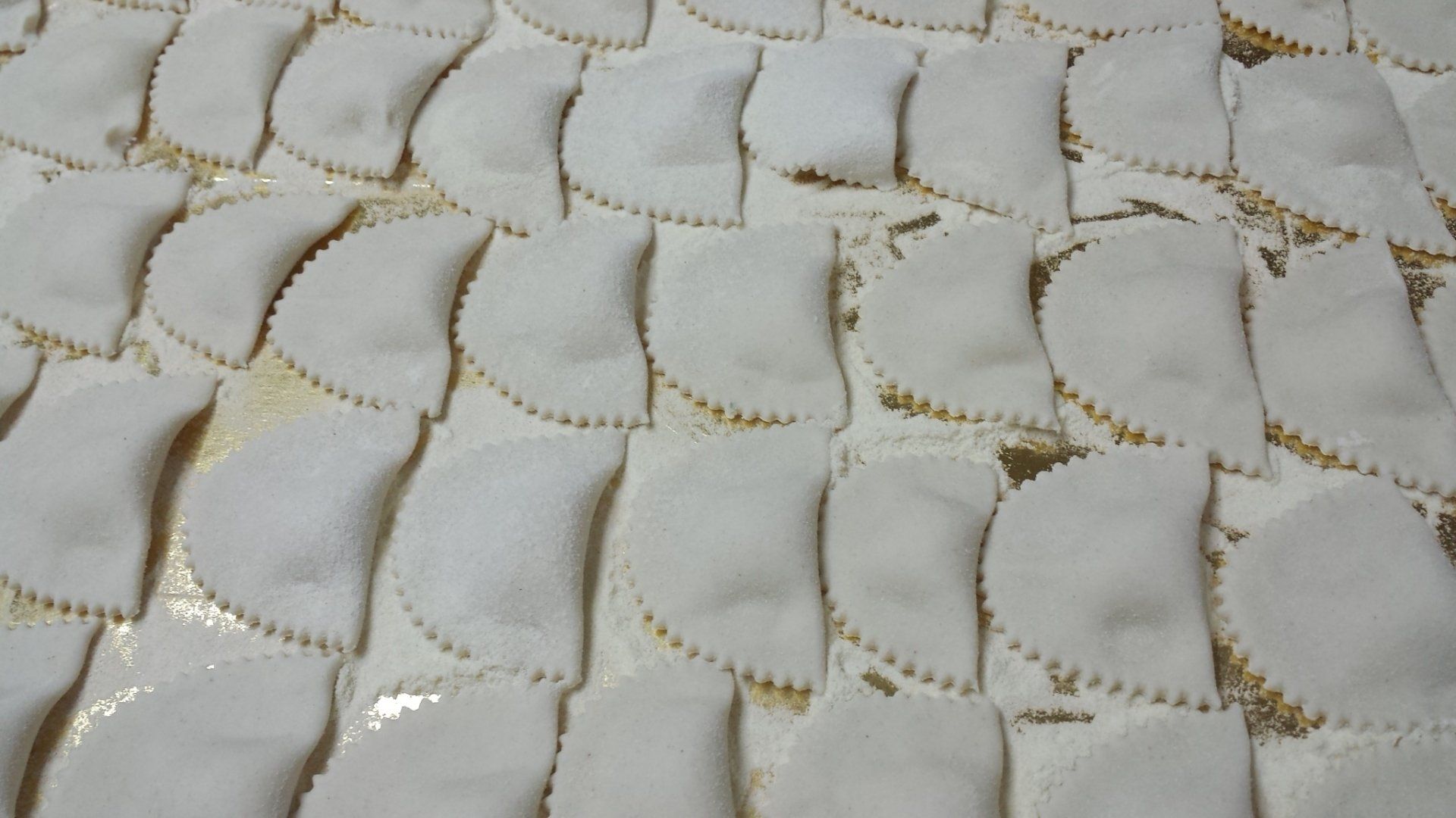 Dosis para 4 personas Ingredientes: Para la masa 1 kg de semolaun huevo tibio agua qbPara el relleno: 1 kg de ricotta fresca dos tintos de berenjena qbun Mechón de perejil un poco de limón rallado una cucharada de azúcar Preparación: Amasar la sémola con un poco de agua tibio salado. Trabaja hasta obtener una mezcla suave y déjala reposar durante unos veinte minutos. Mientras tanto, prepare el relleno mezclando la ricota con las yemas de huevo, el azúcar, el perejil picado y la ralladura de limón. Distribuya el relleno con la bolsa unos cuantos colocando las bolas de ricotta en la masa a intervalos regulares. Dobla la masa y presiona suavemente con los dedos alrededor del relleno para que se adhiera bien. Con la rueda (su rudigliu) cortar los raviolis formando una media luna.