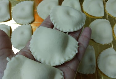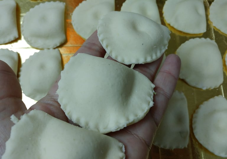 Con la rotellina (su rudigliu) ritaglia i ravioli formando una mezzaluna oppure un quadrato.